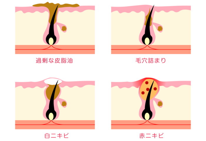 ニキビができる原因の一番は、やはり過剰な皮脂分泌によって毛穴が詰まることです。普段の洗顔が不十分だったり、女性では化粧落としが不十分だったりしても皮脂や垢が毛穴に詰まりやすい状態になり、毛穴に詰まった皮脂がアクネ桿菌と結び付いて増殖するのです。